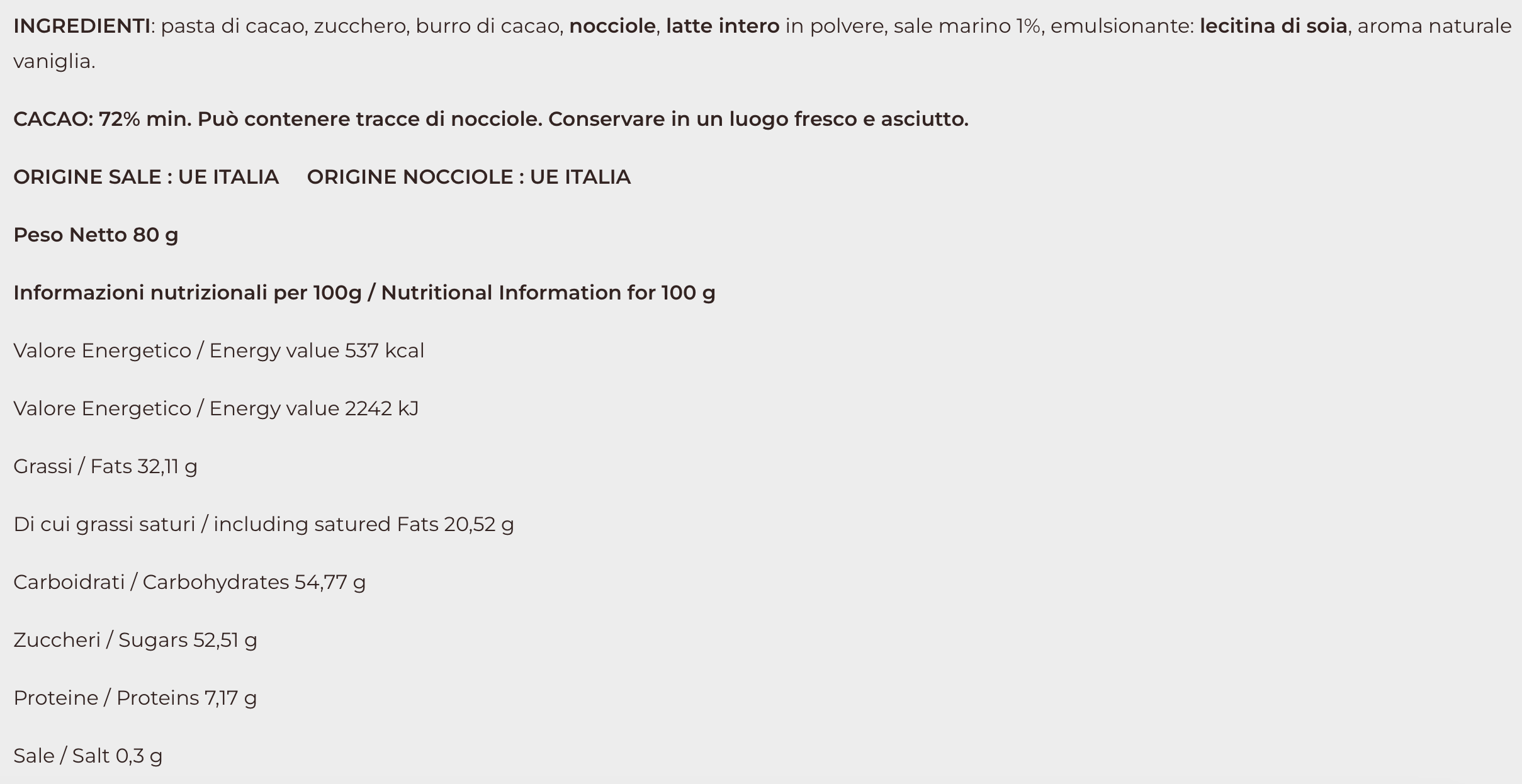 Insolito consists of a base of gianduia and Sweet Salt from Cervia enclosed in a coating of extra dark 72% cocoa chocolate. The result? A flavor you don't expect.