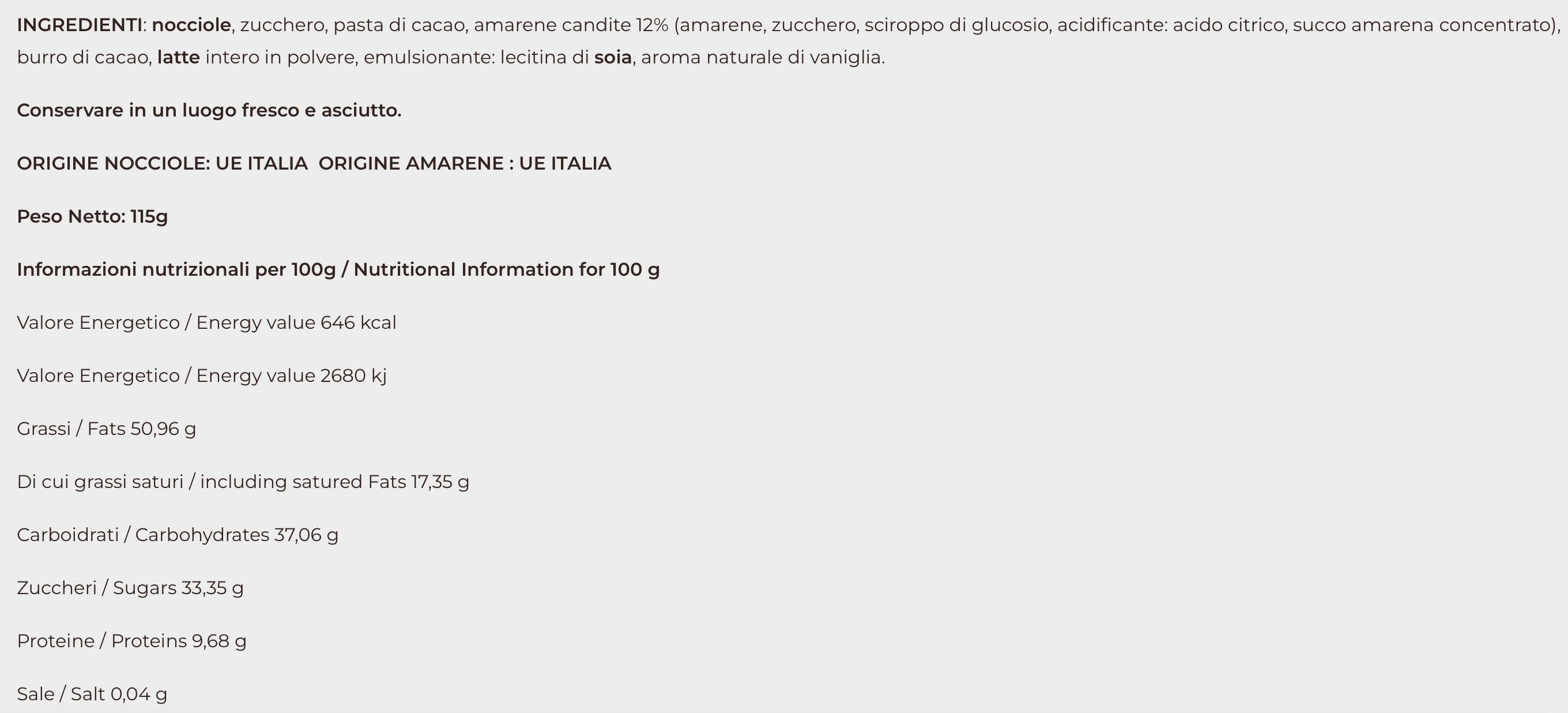 Our bigusto cremino made with hazelnuts from the Langhe and milk and dark chocolate is enriched with black cherries to create a pleasant contrast between sweet and bitter, velvety and crunchy. Perfect as an end to a meal, but also as a snack with bread.
