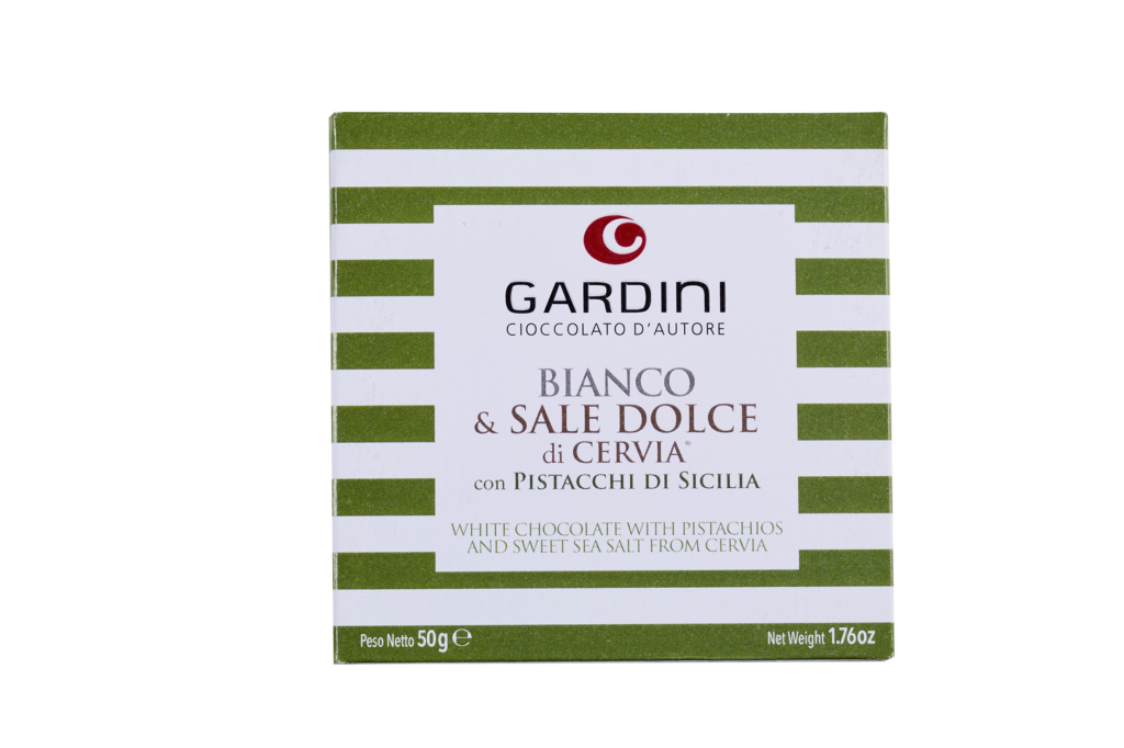 Gardini Tavoletta Cioccolato Bianco con Pistacchi di Sicilia e Sale dolce di Cervia - 50 g