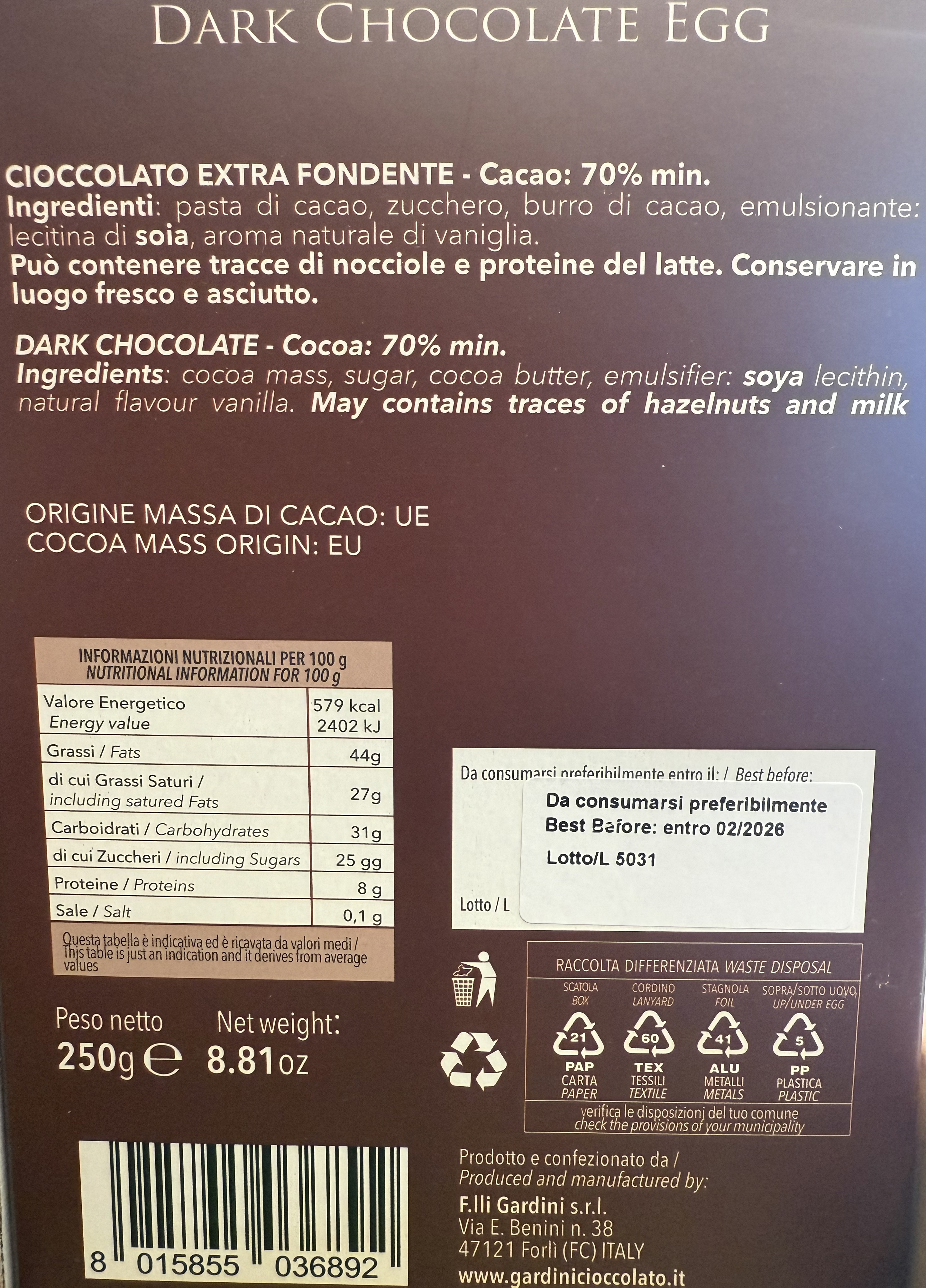Gardini - Uovo di Pasqua Fondente 70% 250g