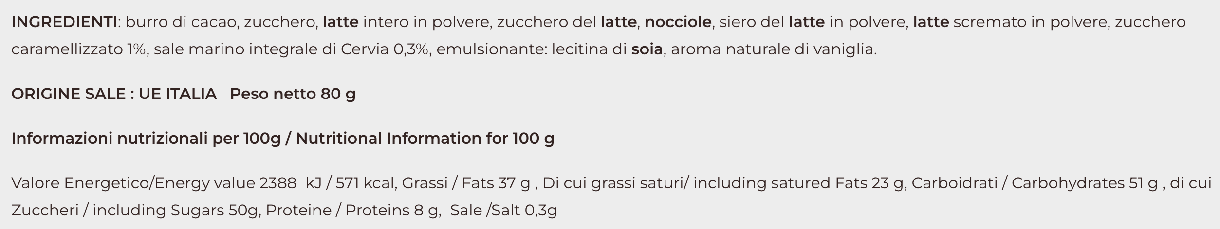 For lovers of contrasting flavors, the milk chocolate version is filled with caramel and sweet Cervia salt.