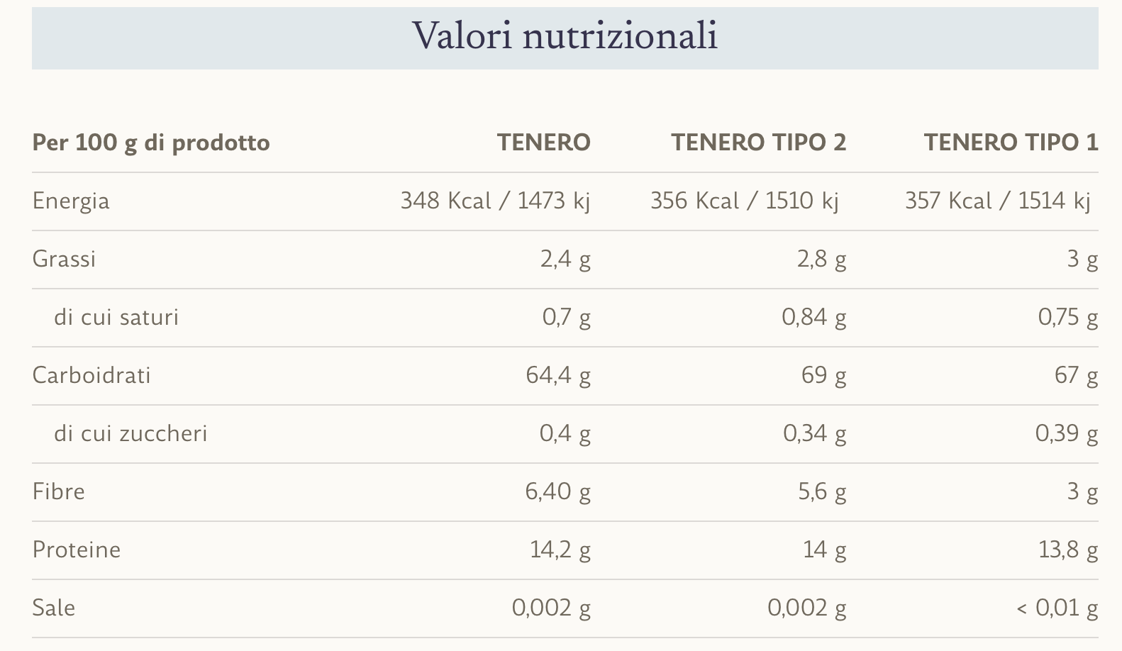 This flour is produced by milling a selection of the best certified soft grains sourced exclusively in Italy.