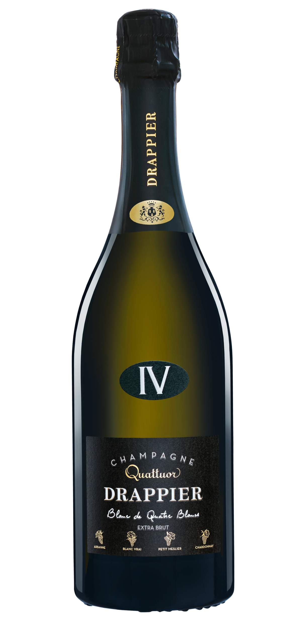 Drappier Quattuor Blanc de Quatre Blancs Brut är en enastående blandning av Arbane, Petit Meslier, Pinot Blanc och Chardonnay. Ljus färg, citrus- och blomsterbouquet. Frisk, elegant, mineral. Perfekt för aperitifer och fisk.