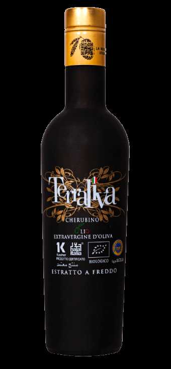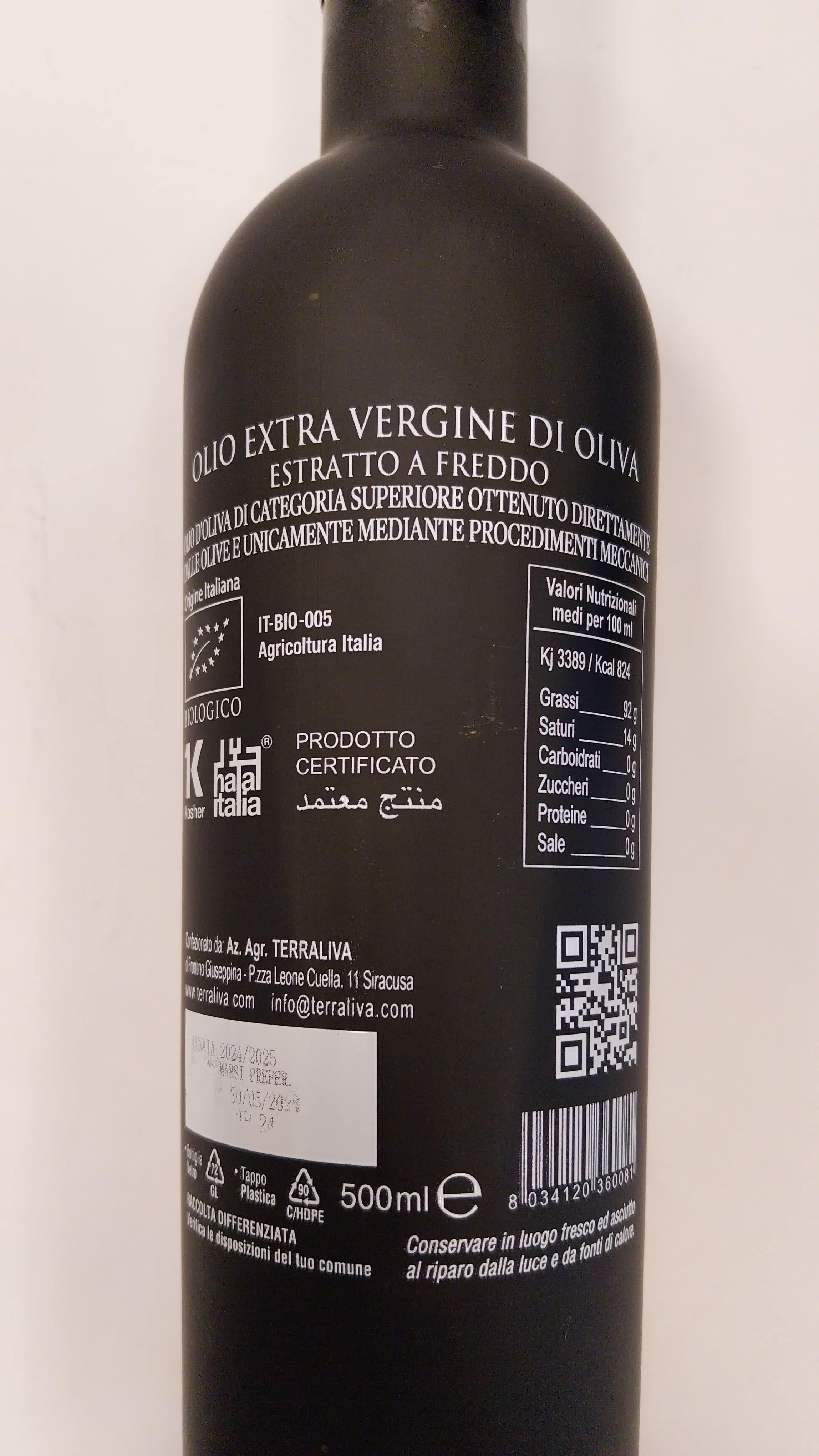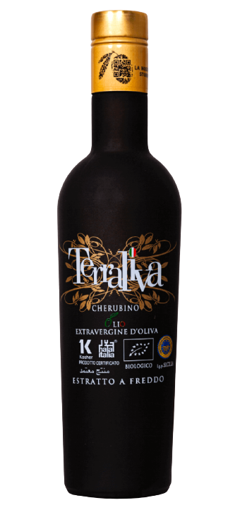 Cold-pressed Extra Virgin Olive Oil certified Organic, IGP Sicily, Kosher, Halal and Slow Food Presidium.