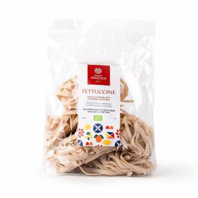 Mulino Angelica's Fettuccine are prepared with stone-milled varieties of ancient Sicilian grains, respecting the grain and maintaining its unaltered characteristics.