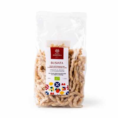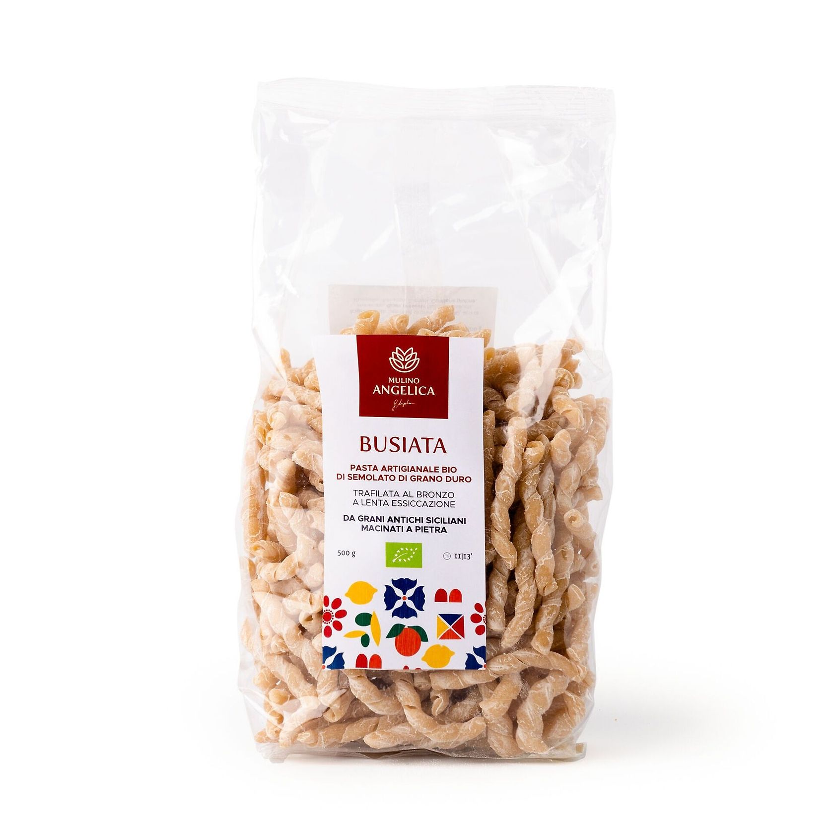 Mulino Angelica's Busiata is prepared with washed and stone-milled varieties of ancient Sicilian grains, preserving their organoleptic properties.