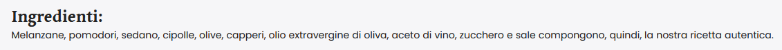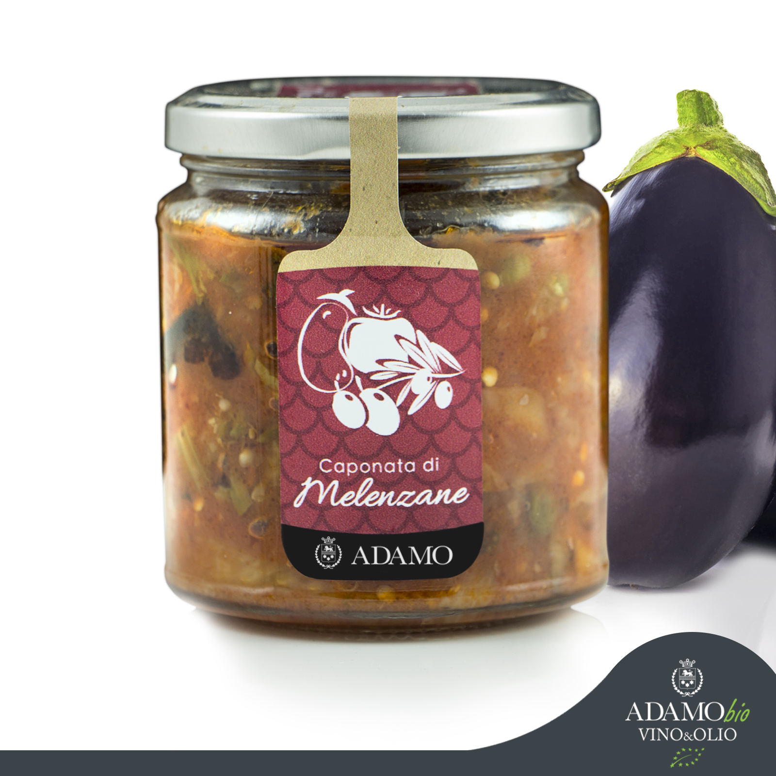 Ingredients: Eggplants 50%, tomatoes, celery, extra virgin olive oil, olives, capers, onion, sugar, vinegar, salt.