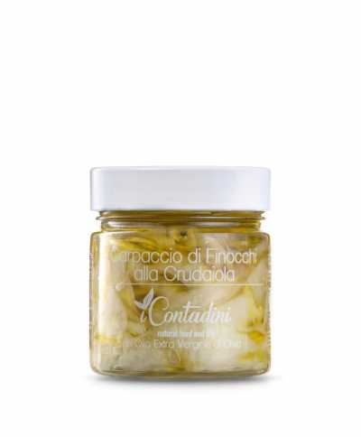 A plant with well-known digestive and carminative properties, rich in essential oils and flavonoids, fennel, is planted in September and harvested by hand starting from February on our farm. It is cleaned, deprived of the hard ribs, and the more tender part is sliced into a fine carpaccio, left to mature in a tanning process and then placed in jars by hand, preserving its organoleptic and nutritional characteristics. When tasted it is crunchy, fresh and fragrant.