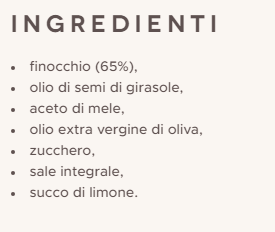 Ingredients: fennel (65%), extra virgin olive oil (29%), apple vinegar, sugar, unrefined salt, lemon juice.