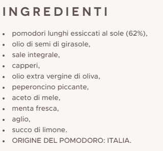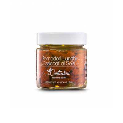 Long tomatoes are grown in April and May, and harvested manually in July and August, all within our farm. They are washed, selected, cut, placed on the drying frames, salted and left in the sun for 4-5 days. Then there is a new selection and a new washing with water and vinegar. Finally they are seasoned with Mediterranean spices and put in extra virgin olive oil. To obtain 1 kg of dried tomatoes, it takes about 10 kg of fresh tomatoes and over 130 hours of processing.